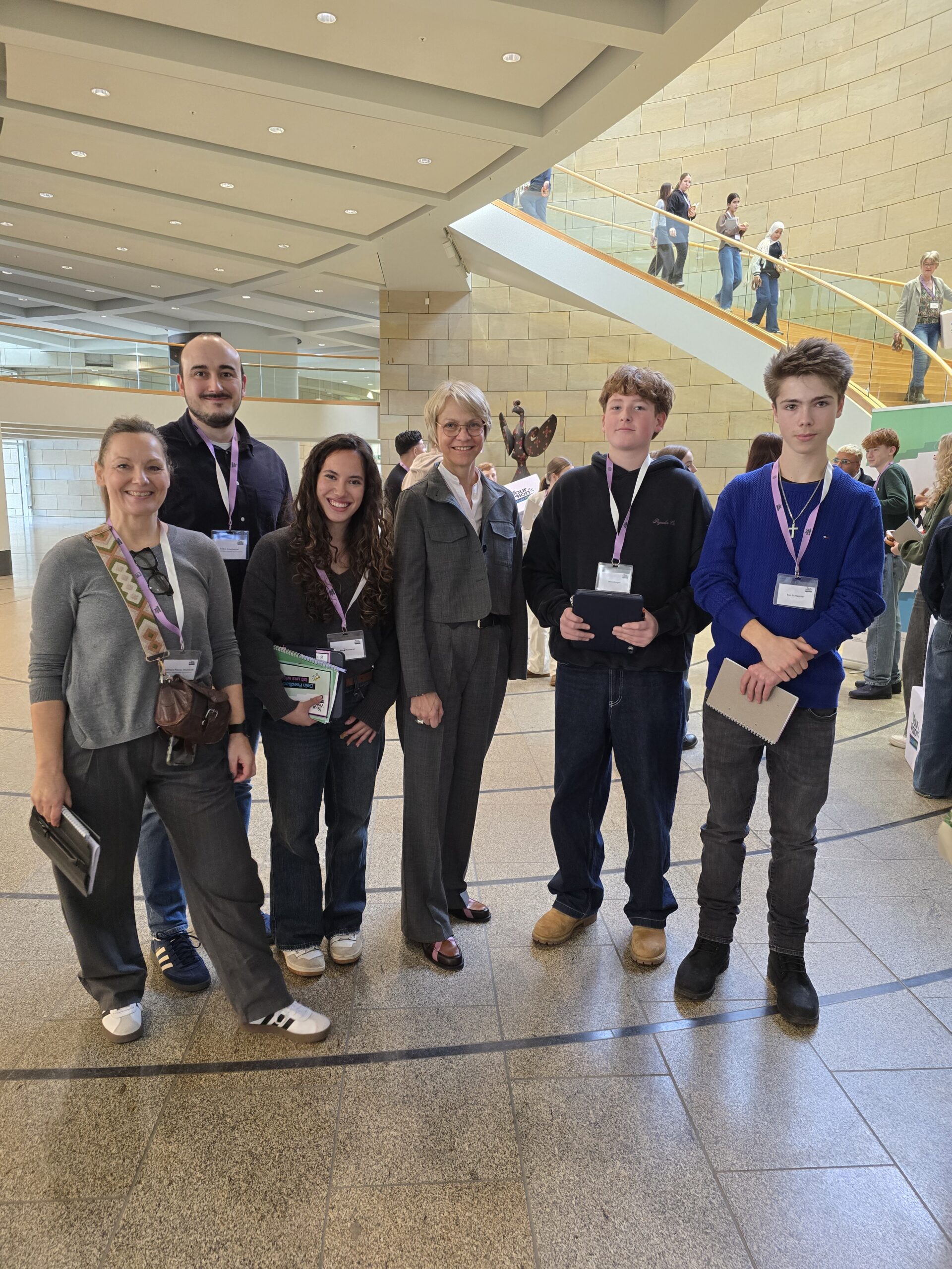 Heute kamen über 150 Schülerinnen und Schüler im Landtag zusammen, um gemeinsam die Ergebnisse von „Your Vision Schule NRW“ zu reflektieren und diese Frau Ministerin Feller zu präsentieren. Auch vier Schülerinnen und Schüler vom DBG waren eingeladen und konnten in Begleitung von Frau Franke-Weinfurth und Herrn Edenharter spannende Diskussionen über die Schule von morgen führen. Am Schluss blieb dann sogar noch Zeit für ein persönliches Erinnerungsfoto mit der Ministerin.